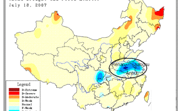 This image illustrates the catastrophic flooding that occurred in China in July 2007, offering a visual representation of the areas most severely affected. Floodwaters inundated vast regions, showcasing the extensive damage and highlighting the urgent need for critical infrastructure improvements.