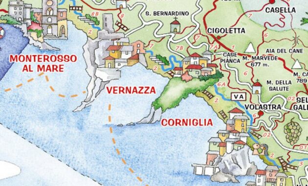 This map serves as an invaluable resource for visitors aiming to uncover hidden treasures nestled within each village. It highlights must-see attractions, from picturesque hiking trails that meander through vineyards and over craggy cliffs, to panoramic views overlooking the Ligurian Sea. Notably, the map delineates the best spots for swimming and sunbathing, making it an essential tool for any traveler.