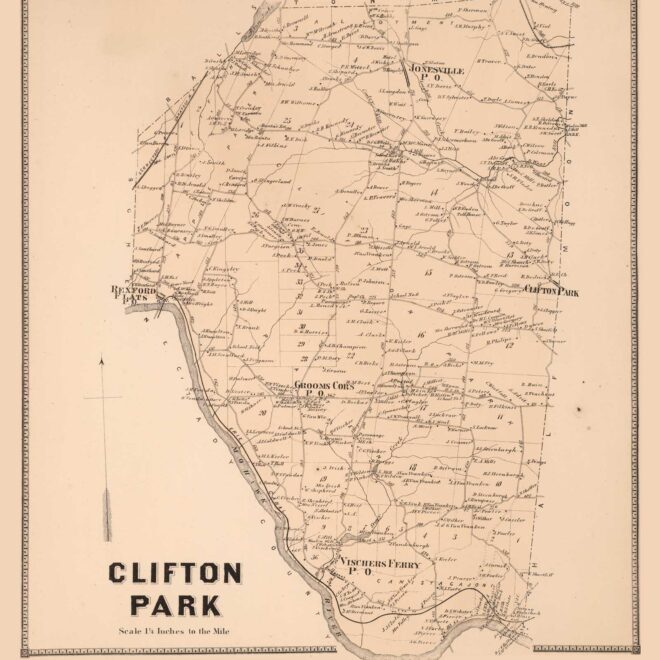 This vintage map from 1866 captures Clifton Park during a period of nascent growth. The detailed illustration delineates early settlements and paths, showcasing the foundational blueprint of what today’s community has built upon. Exploring this map invites one to ponder what life was like for the early inhabitants as they navigated their world.