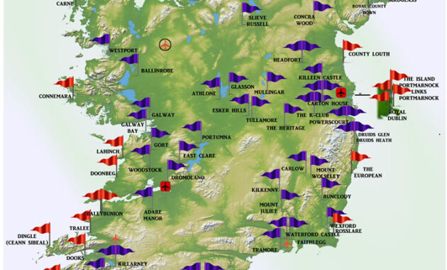 This map serves as a navigational tool for identifying Ireland’s prominent golf locations. Each course offers a unique ambiance, inviting players to revel in not just the game but also the transformative scenery that envelopes them.