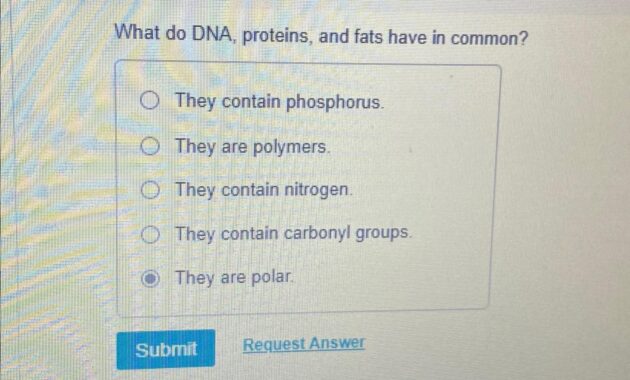 Have you ever pondered the intricate fabric of biological systems? As you delve into the captivating world of macromolecules, an intriguing question arises: What do DNA, proteins, and fats have in common? At first glance, these entities may appear disparate—each distinctly categorized under their unique biochemical roles. Yet, upon closer examination, they reveal a tapestry of connections that are fundamental to life’s processes. Buckle up as we embark on a journey to explore the shared characteristics, functionalities, and the significance of these biological powerhouses.