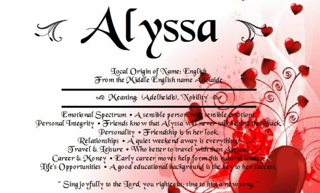 Furthermore, biblical symbolism can articulate deeper meanings behind the name. For instance, the concept of divine love is profoundly embedded in the Christian narrative. Alyssa, symbolizing beauty and healing, may evoke a reminder of love’s transformative power, akin to the agape love described in the New Testament. This presents an avenue for reflecting on personal relationships and divine encounters, stimulating thought about how individuals can embody these traits in daily life.