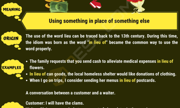Understanding the phrase “in lieu of” opens the door to various interpretations and applications in English vernacular. Primarily, “in lieu of” signals a substitution or replacement; it denotes an alternative option when the original cannot be utilized or is absent. This phrase is often invoked in formal contexts, particularly legal, financial, and employment situations. For instance, in the realm of employment, one might encounter the term “in lieu of notice.” But what exactly does this mean, and what implications does it carry for both employees and employers?
