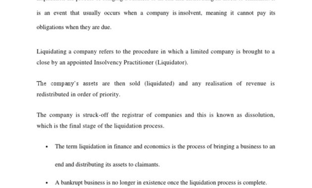 To begin, it is important to comprehend what liquidation means within a business context. Liquidation is the process of converting assets into cash. This usually occurs when a business is unable to meet its financial obligations or when it decides to close its operations either voluntarily or involuntarily. Liquidation can take several forms: voluntary liquidation, where the owners choose to wind down the business, or involuntary liquidation, forced by creditors through legal proceedings.