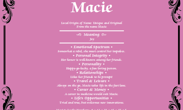 Moreover, the name Macie embodies a sense of empowerment. In a world where names can sometimes dictate social perceptions, Macie stands as a testament to individuality and uniqueness. The versatility of the name is showcased in its adaptability; it can seamlessly fit within various cultural contexts, adding to its global appeal.