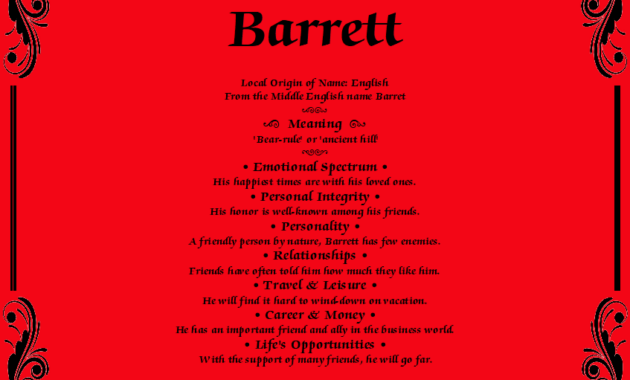 In terms of numerology, Barrett holds the vibrational essence of the number 1. This number symbolizes leadership, ambition, and innovation—qualities that align harmoniously with the name’s traditional connotations. Those named Barrett often find themselves at the forefront, effortlessly navigating life’s complexities with ingenuity and confidence. The name fosters an intriguing dichotomy: it is both regal and approachable, reflecting the versatility of its bearers.