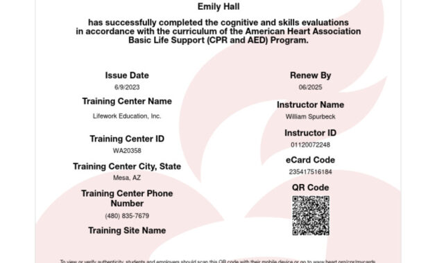 - Use of an Automated External Defibrillator (AED): AEDs are life-saving devices that can deliver an electrical shock to restore a normal heart rhythm. BLS certification includes training on the safe and effective use of AEDs. This involves understanding the device’s operation, recognizing appropriate scenarios for its use, and adhering to safety precautions.