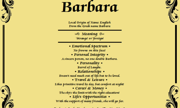 The name Barbara is steeped in rich cultural significance, emanating a spiritual resonance that captivates the imagination. Its origins can be traced to the Greek word “barbaros,” meaning “foreign” or “strange.” This etymology carries an intricate tapestry of meanings, suggesting a connection to the unknown and the unexplored realms of existence. The name evokes a sense of mystery, inviting reflection on the nature of individuality and the dichotomy between the familiar and the alien.